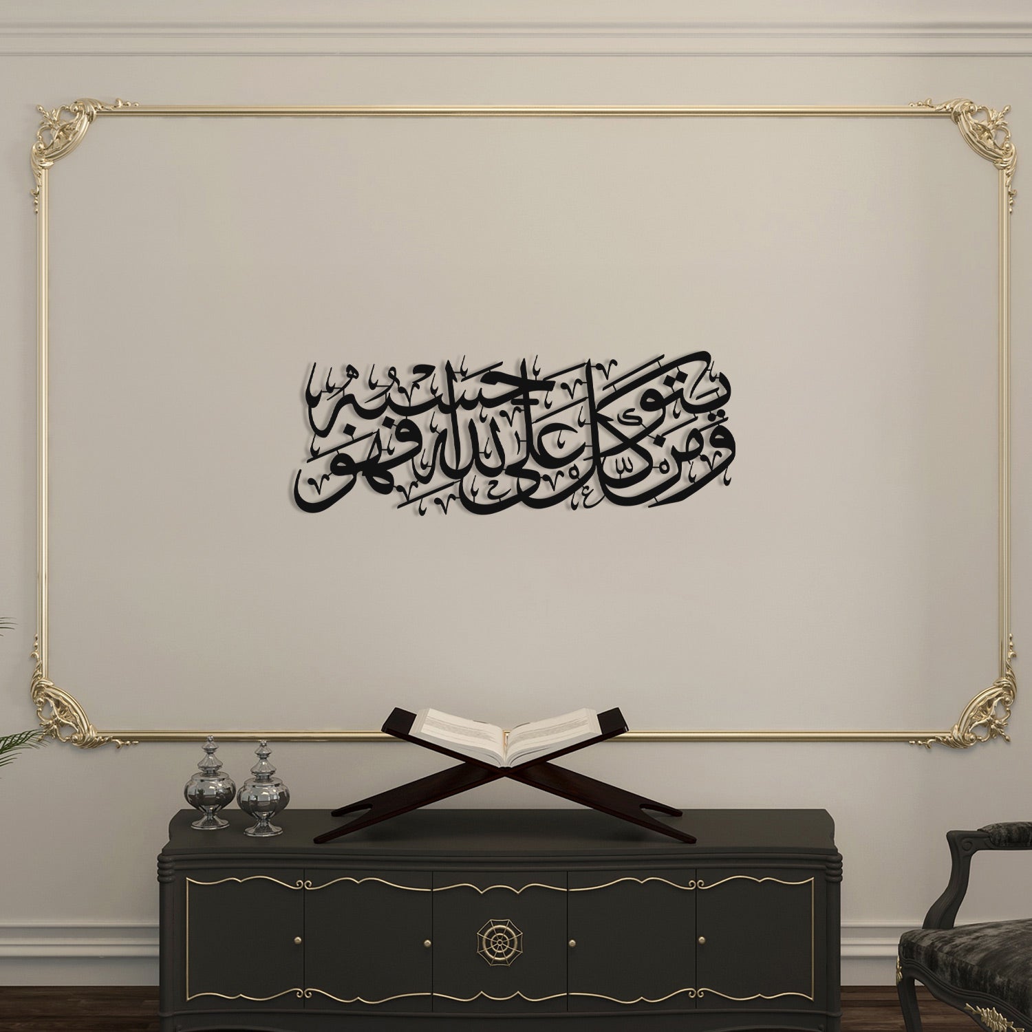 This elegant metal wall art beautifully combines the inspiring message of Surah At-Talaq 3 with the grace of Islamic calligraphy.